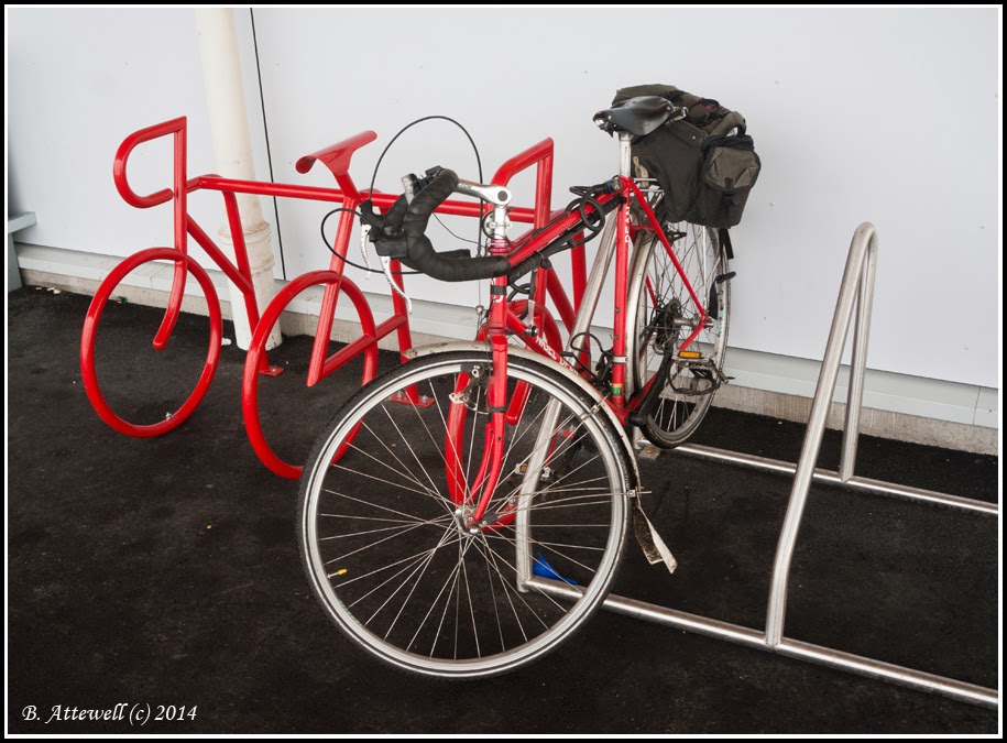Approaching Consett I saw the last of the sun for the day and, tired and thirsty, looked for sustenance at the newly opened Tesco superstore. I was pleased to see the provision of a bike rack under shelter, but the detail design leaves much to be desired. It's very much a case of style over substance. The racks are placed far too close to the wall, so that you cannot get the frame of the bike sufficiently close to the higher point in the rack without jamming the wheel against the wall. The red things are almost purely decorative, I can't envisage how you could use them. Why people don't just specify standard Sheffield Stands I don't know, I suspect that they are cheaper and they are certainly much more functional. I did fill in a feedback form, hopefully someone will take action.